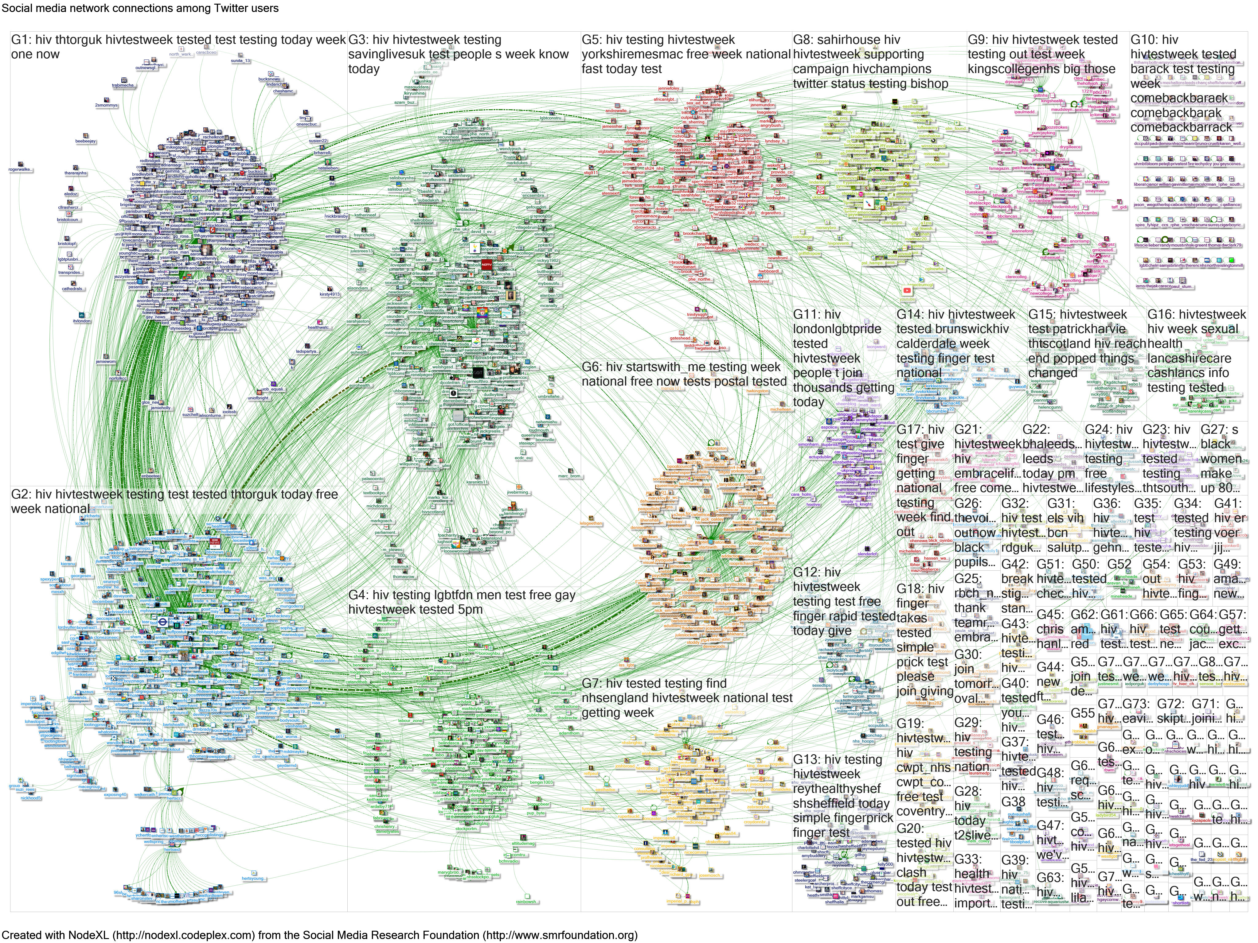 A NodeXL graph for the two campaigns (EuroTestWeek or HIVTestWeek) together is shown below (full report here):