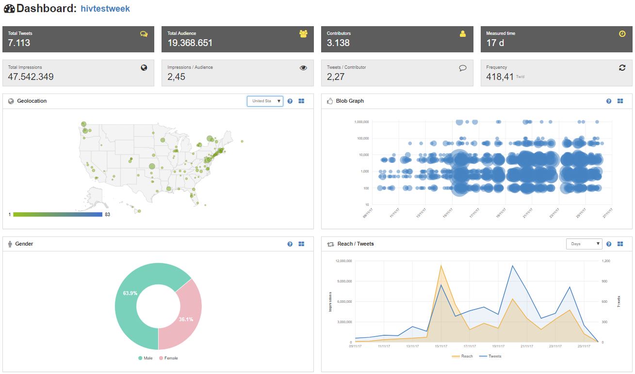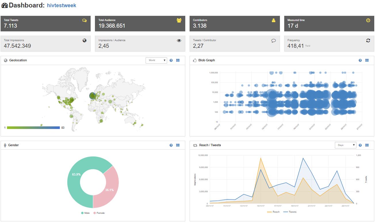 The following statistics show impressive international reach: mainly in Europe for EuroTestWeek, but interest elsewhere too; wider reach for the HIVTestWeek campaign. The summary of top content (Storify pages) shows greater diversity of posts for the EuroTestWeek campaign; for HIVTestWeek many of the top posts featured the posters, with their clear and striking images of individuals representing different test groups. There was some further testing using accessory hashtags (eg TestTreatPrevent and Time2Test but most of these tweets also included either the EuroTestWeek or HIVTestWeek so are included in the analysis presented below).