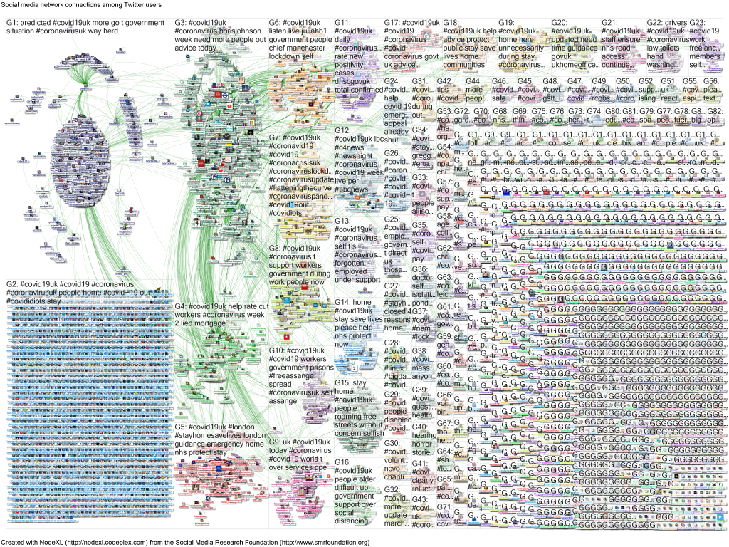 This blog provides access to data on tweets using the #Covid19UK hashtag during the UK lockdown, the first day of which began on 24 March 2020. The data were extracted using TAGS, and then mapped using NodeXL. There were of course other UK-focused hashtags used during this period and some UK-based Covid-19 tweeting that did not use any hashtag. However it was unfeasible to capture all the data. I therefore stuck with one hashtag all the way through. You can see further information, including other search terms and ways of presenting data, in a tweet thread. These data are updated on a weekly basis (except where there is too much data to plot at once, in which case they are charted by day). There’s more about this work on the BMJ Opinion blog.