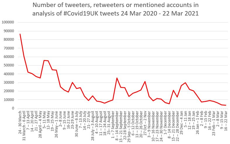 The number of Twitter accounts included in the weekly extracts has varied over time, peaking at the start of lockdown, a quiet period over the summer, an increase during September as we contemplated a return of stricter lockdown rules, and again the week before 2nd lockdown rules were introduced in England (2nd national lockdown commenced 5 November), with further restrictions for 26 December and nationwide lockdowns announced 5 January 2021.