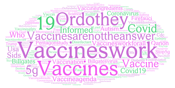 Antivaccination tweeters tweeting using the campaign hashtag or related terms were in a quite separate group to the rest of the tweeters, with limited interaction with other tweeters. It would be unfeasible to inspect all the tweets individually, so the most widely disseminated antivaccination tweets were identified rapidly. In order to further study the antivaccination bubble rapidly, so that the findings would be useful during the first wave of the pandemic, a convenience sample was obtained using a set of simple rules. The retweeters of the most widely shared antivaccination posts were identified and their other tweets and retweets were identified from the extract. This process of identifying tweeters and retweeters was repeated for five further cycles. Using the final list of antivaccination tweeters/retweeters, the hashtags most commonly used by this group were identified and those hashtags that were specifically associated with antivaccination messaging were selected for further searching. The hashtags identified in the full dataset and the final antivaccination search were summarised in word clouds using freely available online software that charts aggregate data, as required for the large number of tweets extracted.(13)