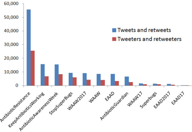Results: #AntibioticResistance was the most commonly used hashtag (Figure 2). The tweeting and retweeting peaked during the second half of each day, corresponding with tweeting from Europe, Africa and the Americas (Figure 3). Activity fell over the weekend, which coincided with European Antibiotic Awareness Day.