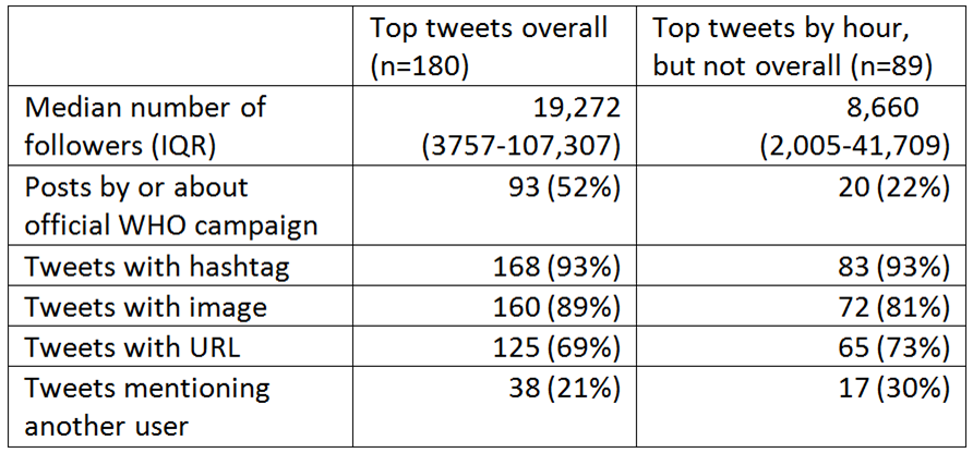 Two groups of tweets were selected for further study: the 180 most retweeted posts overall (click to view full list); and a further 89 tweets that were the most shared posts for the hour they were posted (click to view list). The characteristics of tweeters and tweets varied by group (Table).