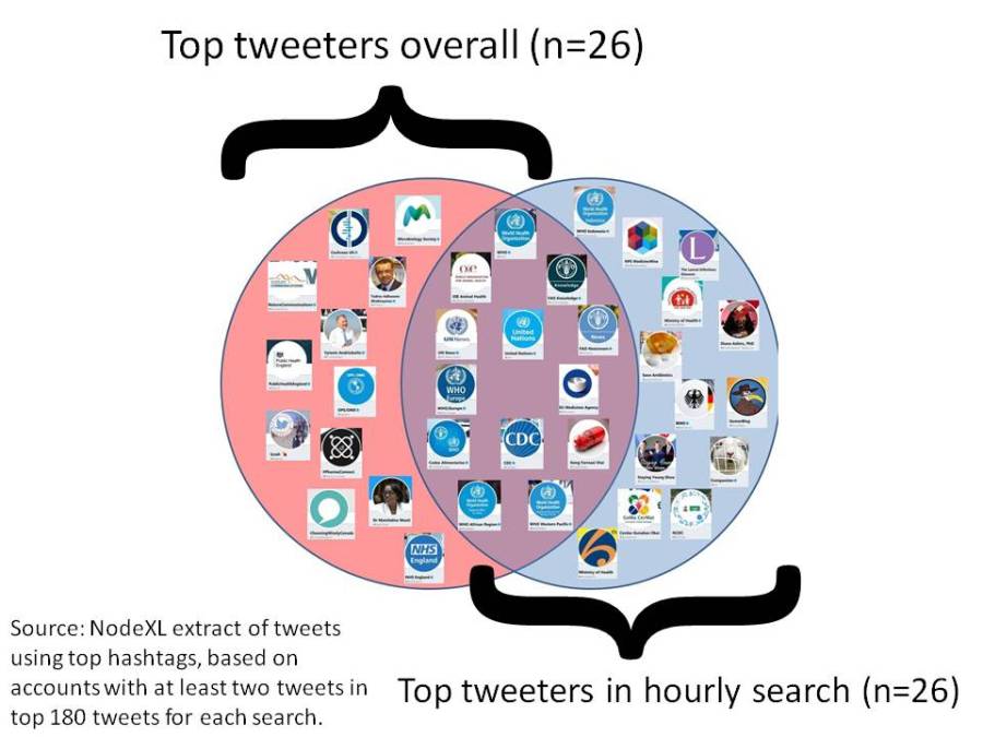 There was overlap between the two groups (Figure 4). WHO and other supranational organisations featured in both lists. There was more diversity identified in the hour by hour analysis, with tweeters from across the world, gindividuals and journals identified alongside government organisations and NGOs.